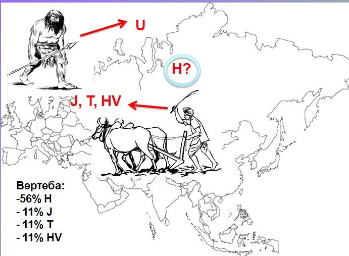 Останнє пояснює одну з найвищих у Європі частоту Н у сучасних жителів гірських районоа Карпат і високий процентний вміст цієї групи у трипільського населення. Характерно те, що сублінії Н з Вертеби не належить таким відгалуженням Н, як Н1 і Н3, експансію яких у період голоцену можна з достовірністю пов’язати з Франко-Кантабрійське регіоном. Це підкреслює можливість експансії окремих відгалужень групи Н саме з території сучасної України в після-льодовиковий період. Що стосується переважного переважання Н над U в плані «виживання» під напором фермерів, то це можна пояснити вихідним чисельним переважанням носіїв Н над носіями групи U, особливо в місцях близьким до зон льодовикових притулків (Карпати, Крим і південно-західна Європа).
