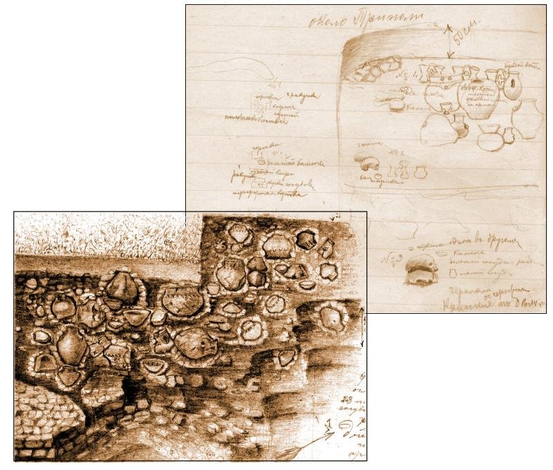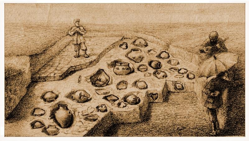 Рис.1. Розкопки трипільських площадок поблизу Трипілля. Малюнки В.В. Хвойки.