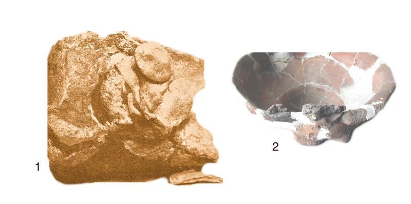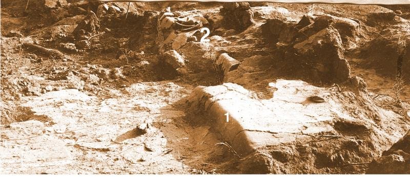 Рис. 4. Фрагмент площадки у Стіні. 1 – глиняне підвищення під шаром обпаленої глини, 2 – роздавлена посудина. Розкопки С. Гамченка