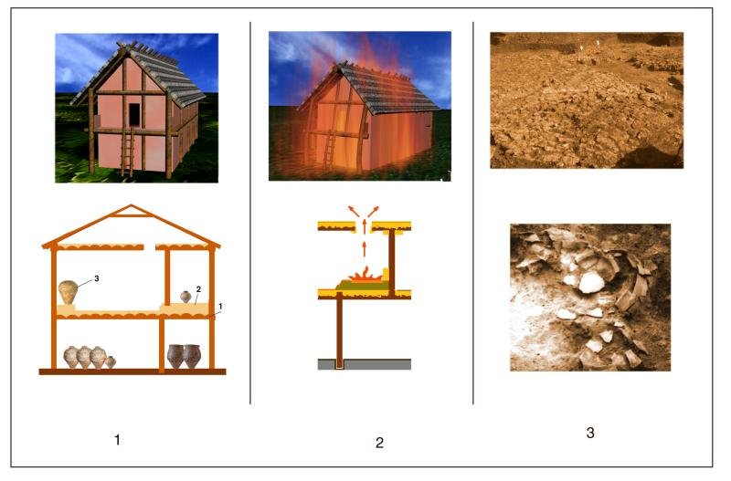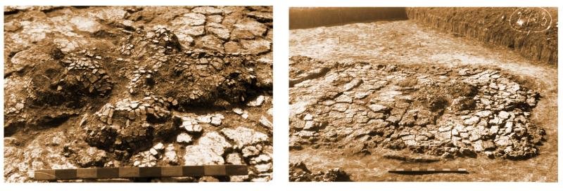 Залишки багатошарової підлоги житла, яка складалася з дерев’яного настилу, укладеного на землю та його глиняної обмазки, обпаленої зверху кострами, а також деталей інтер’єру |