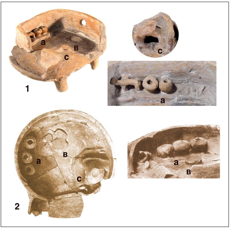 Рис. 8. Моделі жител із відтворення інтер’єру з Сушківки (1) та Попудні (2), а – подіум з великими посудинами,