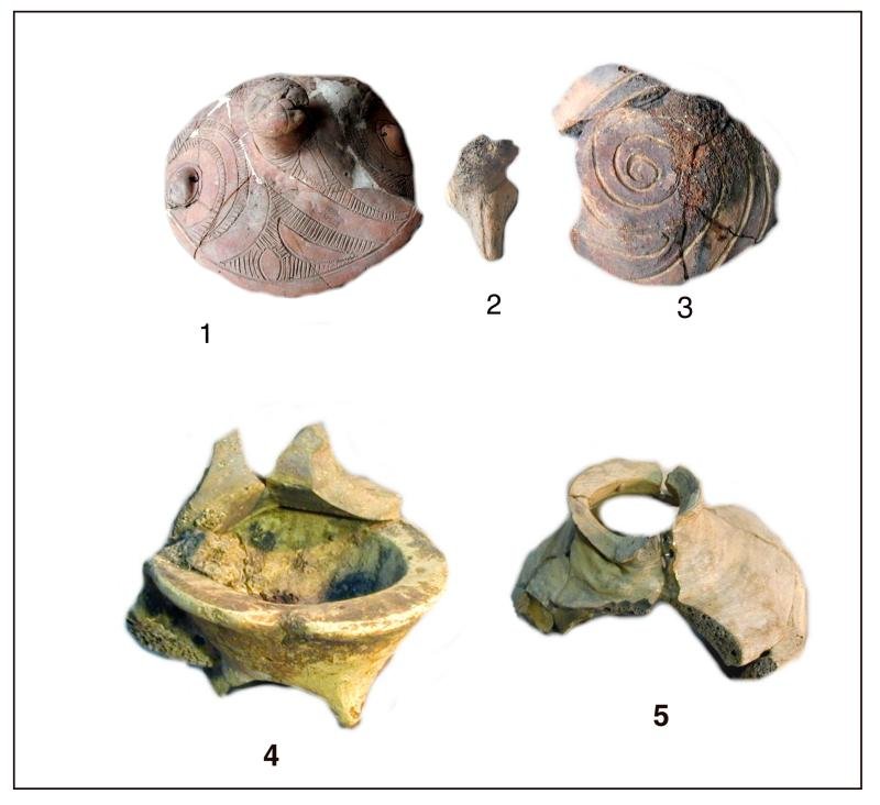 Рис. 9. Кераміка та статуетка, що зазнали сильного повторного випалу. 1-3 – Олександрівка, 4-5 – Черкасів Сад ІІ.