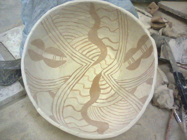 Тепер миску або вазу можна було декорувати. Орнамент наносився по розроблених мною ескізах на поверхню ангобом