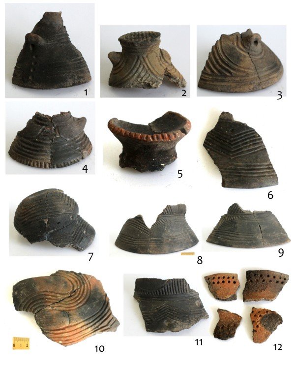 Рис.5. Трипілля 2018. Знахідки з шурфа 3. Фрагменти керамічного посуду із заглибленим орнаментом