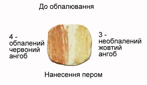 Ангоб розведений на камеді, жовтку прекрасно лягає на випалену поверхню і при висиханні до рук не береться (рис.10). Якщо його піддати нагріванню до 400°С — руйнується і обсипається. Для кращого закріплення орнаменту, розписану посудину можна нагріти приблизно до 200°С і навоскувати. Хоч при цьому поверхня темнішає, але орнамент краще захищений від ушкоджень.
