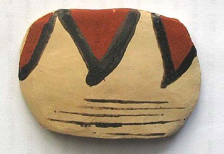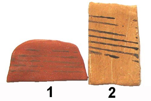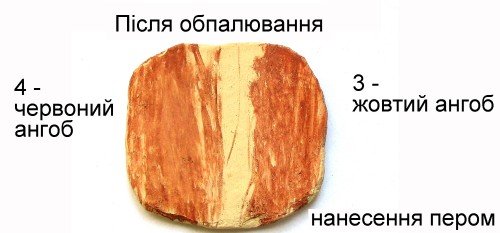На сиру поверхню глиняної пластини нанесені пташиними перами обидва ангоби (червоний, прокалений при 200°С та жовтий).