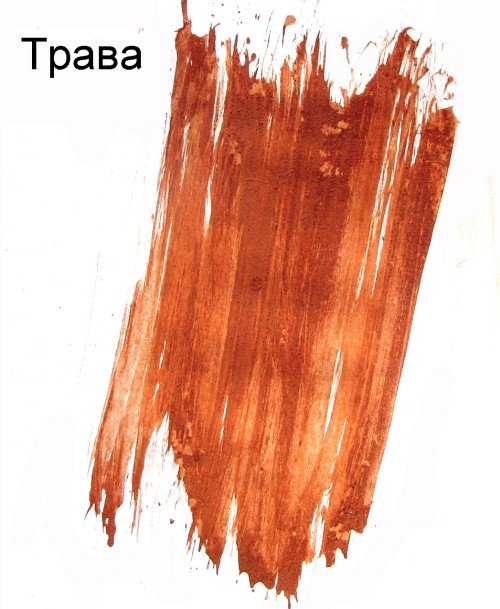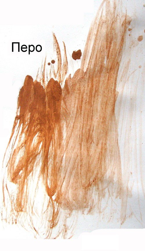 Використаний помазок із трави, пучок пташиного пір’я та щетинний пензель. Звичний для нас пензлик із тваринної шерсті лишає після себе або повністю зафарбовану поверхню, або густі паралельні мазки.